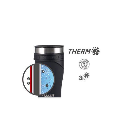 Hochwertiger und dichter Thermobecher aus rostfreiem Edelstahl. Er ist mit einem ergonomisch geformten Handgriff und eine drehbare Abdeckung ausgestattet. Heißgetränke wie Kaffee oder Tee bleiben bis zu 3 Stunden warm. Der rutschfeste Boden des Behälters sorgt für einen optimalen Halt. Keine Übertragung der Innentemperatur auf die Außenwand - sie bleibt kühl. Die spanische Firma LAKEN gewährleistet seit über 100 Jahren Top-Qualität.